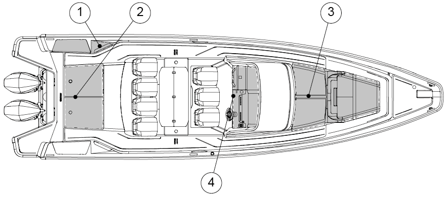 The electric bilge pumps are submersible. One electric bilge pump is located under the berth of the aft cabin or under the storage hatch and another under the front cabin floor. The electric bilge pumps are by default in automatic mode and pump out the bilge once the float-switch is triggered. The electric bilge pumps can also be started manually from the boat’s main control panel.