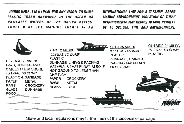 Liquids here. It is illegal for any vessel to dump plastic trash anywhere in the ocean or navigable waters of the United States. Annex V of the Marpol Treaty is an international law for a cleaner, safer marine anvironment., Violation of these requirements may result in civil penalty up to $25,000, fine and imprisonment. U.S. lakes, rivers, bays, sounds and 3 miles from shore Illegal to dump plastic & garbage, paper, metal, rags, crockery, glass, dunnage, food. 3 to 12 miles Illegal to dump plastic, dunnage, lining & packing materials that float. Also if not ground to less than one inch: paper, crockery, rags, metal, glass, food 12 to 25 miles illegal to dump plastic, dunnage, lining & packing materials that float Outside 25 miles illega do dump plastic State and local regulations may further restrict the disposal of garbage. |