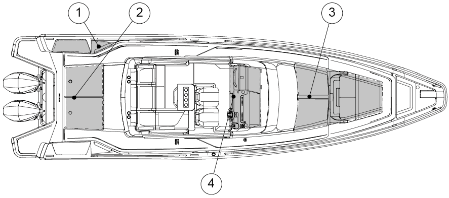 The electric bilge pumps are submersible. One electric bilge pump is located under the berth of the aft cabin or under the storage hatch and another under the front cabin floor. The electric bilge pumps are by default in automatic mode and pump out the bilge once the float-switch is triggered. The electric bilge pumps can also be started manually from the boat’s main control panel.