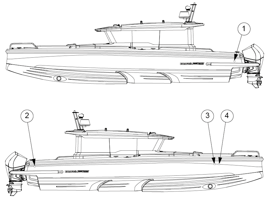 The figure shows the bilge pump outlets through the side. Always check in the spring when launching that the outlets through the side and bottom are tightly closed.