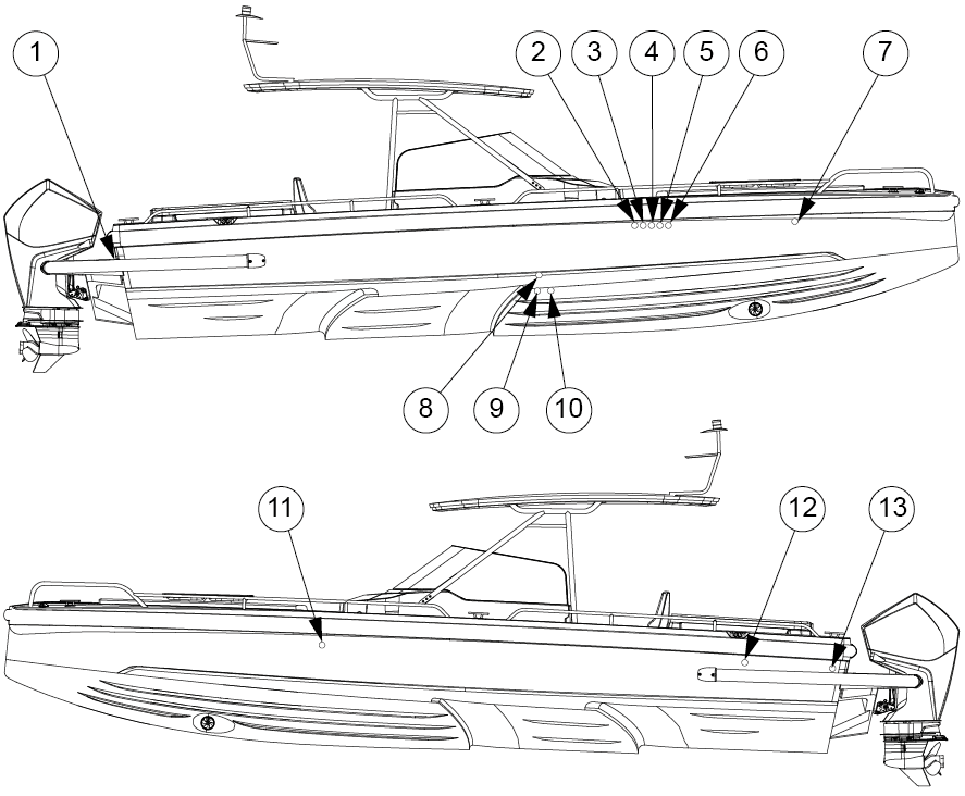 The figure shows the seacocks and inlets through the side. Always check in the spring when launching that the inlets through the side and bottom are tightly closed.