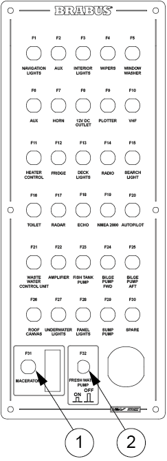 The panel has a combined switch and fuse for the macerator and fresh water pump. The fuse panel also has a 12 V output.