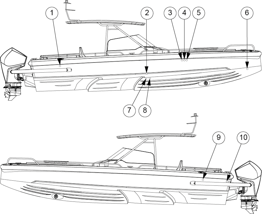 The figure shows the hatches that must be kept closed while under way or when the boat is attached to the dock.
