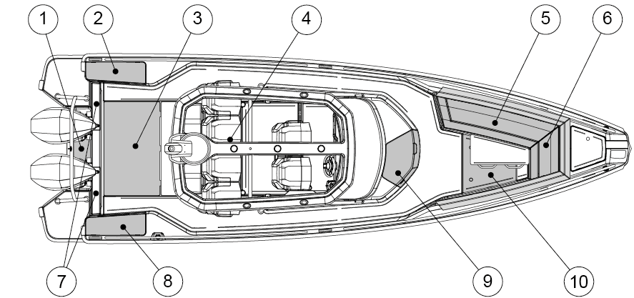 The figure shows the hatches that must be kept closed while under way or when the boat is attached to the dock.