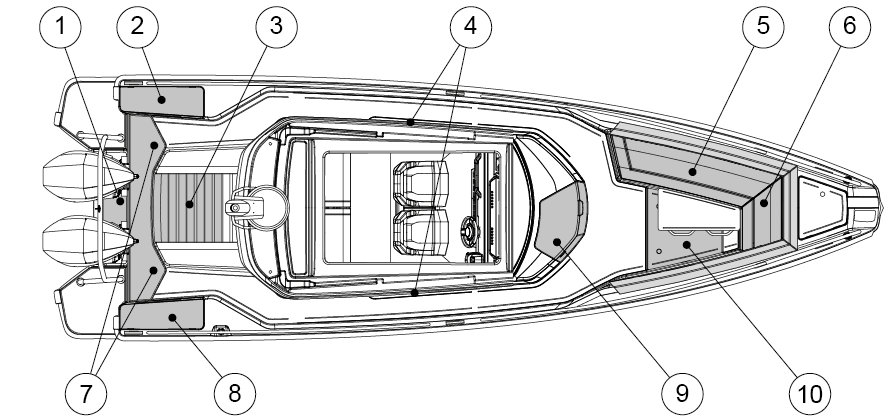 The figure shows the hatches that must be kept closed while under way or when the boat is attached to the dock.