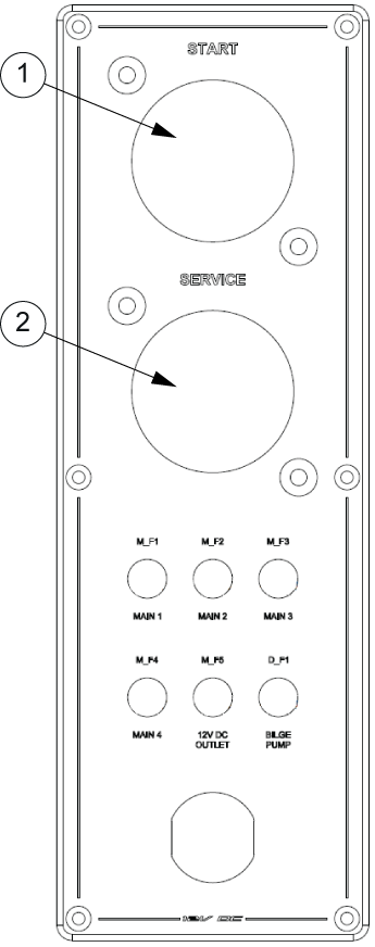 L’alimentation en courant du moteur est obtenue en tournant l’interrupteur « Start » (Marche) en position « On » (Marche), l’alimentation des autres équipements est obtenue en tournant l’interrupteur « Service » (Entretien) en position « On » (Marche) et l’alimentation du propulseur d’étrave est obtenue en tournant l’interrupteur « Aux » (Auxiliaire) en position « On » (Marche).