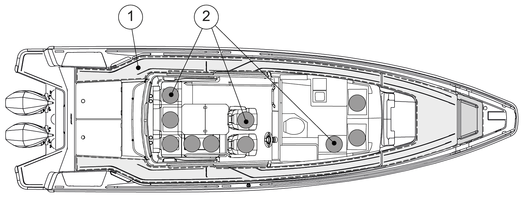 Si les coussins des bains de soleil ou la table sont installés sur le pont avant, respectez la vitesse maximale de 15 nœuds pour éviter que les coussins ou la table ne se détachent à grande vitesse ou en cas de fortes vagues.