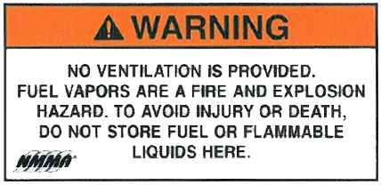 Warning No ventilation is provided. Fuel vapors are a fire and explosion hazard. To avoid injury and death, do not store fuel or flammable liquids here. |