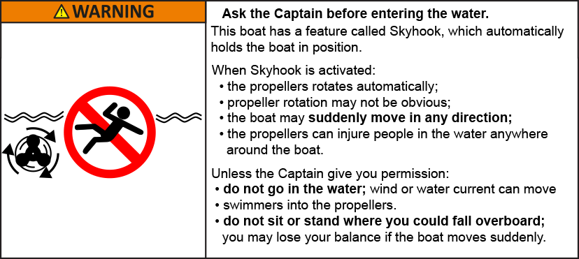 Ask the captain before entering the water The boat has a Skyhook feature which automatically holds the boat in position. When Skyhook is activated: