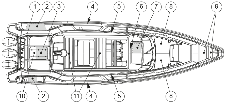 The figure shows the hatches that must be kept closed while under way or when the boat is left unmanned.