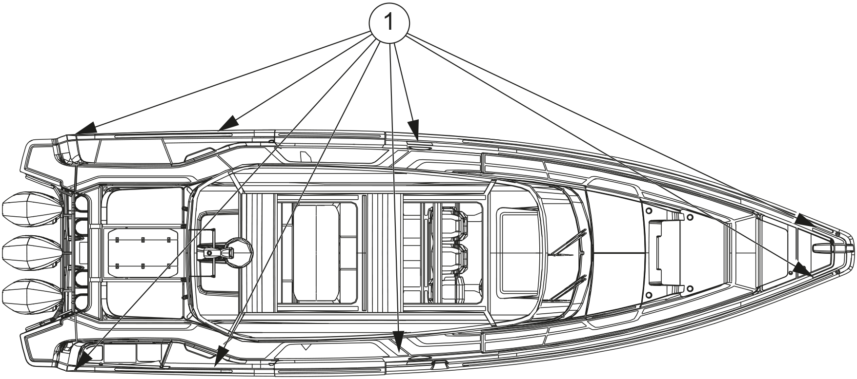 Fastening points (or cleats) are located both at the stern, midship and bow.