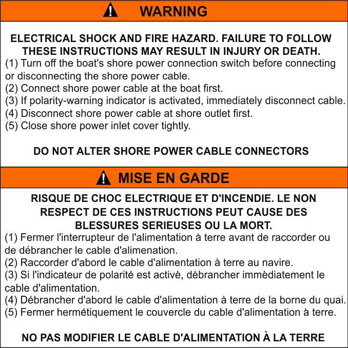 Warning Electrical shock and fire hazard. Failure to follow these instructions may result in injury or death. (1) Turn off the boat's shore power connection switch before connecting or disconnecting the shore power cable. (2) Connect shore power cable at the boat first. (3) If polarity-warning indicator is activated, immediately disconnect cable. (4) Disconnect shore power cable at shore outlet first. (5) Close shore power inlet cover tightly. Do not alter shore power cable connectors |