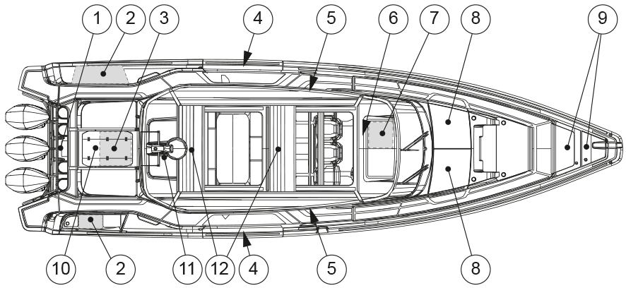 Le schéma indique les trappes qui doivent être maintenues fermées pendant la navigation ou lorsque le bateau est laissé sans surveillance.