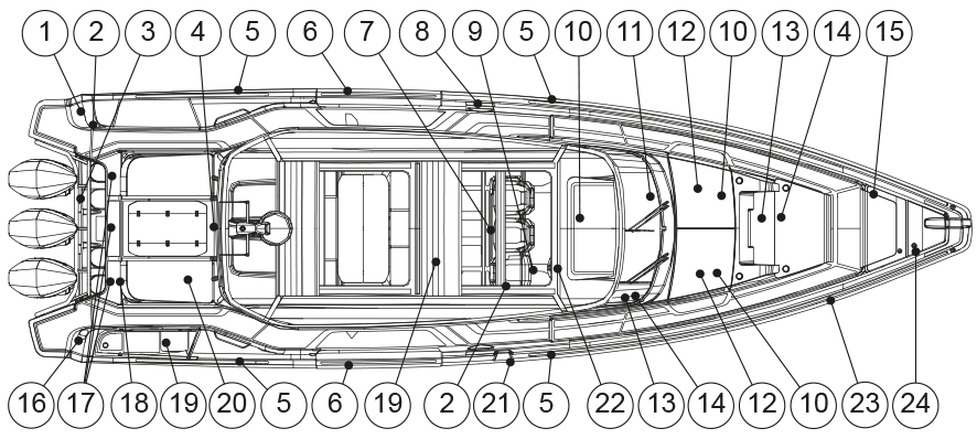 Liste de contrôle du pilote Pour un maximum de plaisir et de sécurité, vérifiez chacun des éléments suivants avant de démarrer votre moteur : – Bouchon de vidange (bien en place ?) – Dispositifs de sauvetage (un pour chaque personne à bord ?) – Système de direction (fonctionne parfaitement ?) – Système de carburant (carburant adéquat ? Présence de fuites ? Émanations de fumées ?) – Batterie (complètement chargée ? Cosses de câbles propres et bien serrées ?) – Moteur (au point mort ?) – Plaque de capacité (surcharge ou surpuissance ?) – Équipement électrique (feux, avertisseur sonore, pompe, etc. ?) – Équipement de secours (extincteur, écope, pagaie, ancre et ligne, dispositif de signalisation, trousse à outils, etc. ?) |