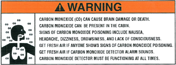 Avertissement Le monoxyde de carbone (CO) peut provoquer des lésions cérébrales, voire la mort. Du monoxyde de carbone peut être présent dans la cabine. Les signes d’intoxication au monoxyde de carbone incluent des nausées, des maux de tête, des étourdissements, une somnolence et une perte de conscience. Si une personne présente des signes d’intoxication au monoxyde de carbone, faites sortir à l’air frais toutes les personnes à bord. Sortez à l’air libre si l’alarme du détecteur de monoxyde de carbone retentit. Le détecteur de monoxyde de carbone doit toujours être en bon état de fonctionnement. |