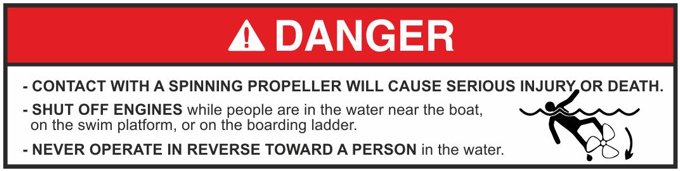 Danger Tout contact avec une hélice en rotation peut entraîner des blessures graves, voire la mort. Restez à l’écart du bateau et ne montez pas sur la plateforme de baignade ni sur l’échelle d’embarquement lorsque le moteur tourne. |