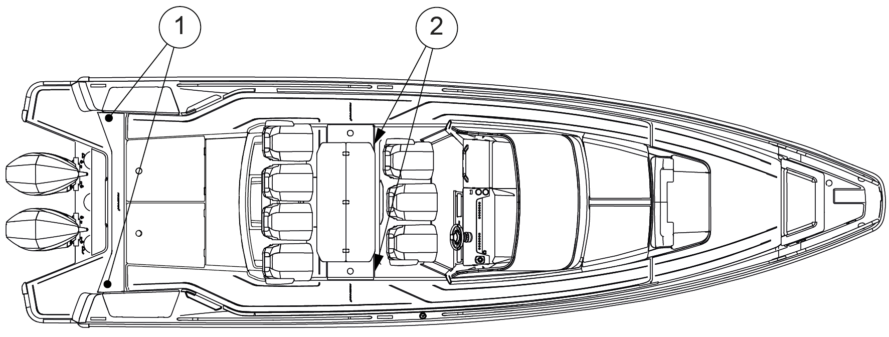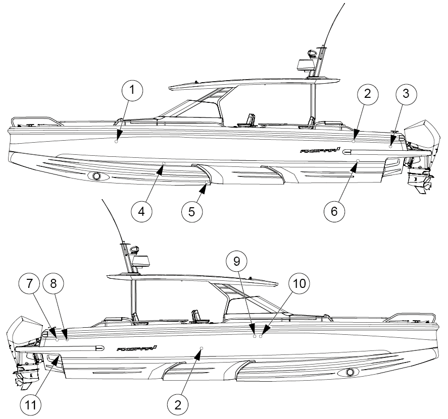 La figure indique les emplacements des passe-coques installés sur le bateau.