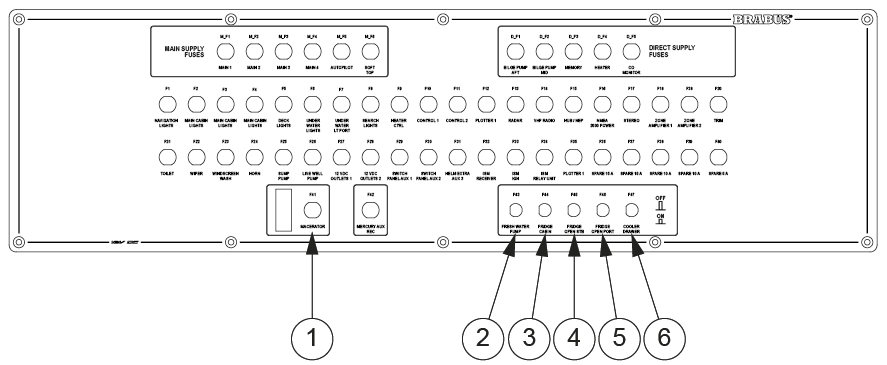 Le panneau de fusibles est situé sur la paroi arrière de la cabine avant. Le panneau comporte un interrupteur combiné avec fusible pour le dilacérateur, la pompe à eau douce, le réfrigérateur de la cabine, le réfrigérateur à ouverture tribord, le réfrigérateur à ouverture bâbord et le tiroir-glacière.